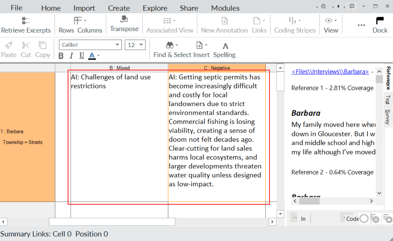 Using the AI Assistant: Summarize Coded Content option, you can use AI Assistant to automatically generate AI summaries from the coded content in the selected matrix cell(s).