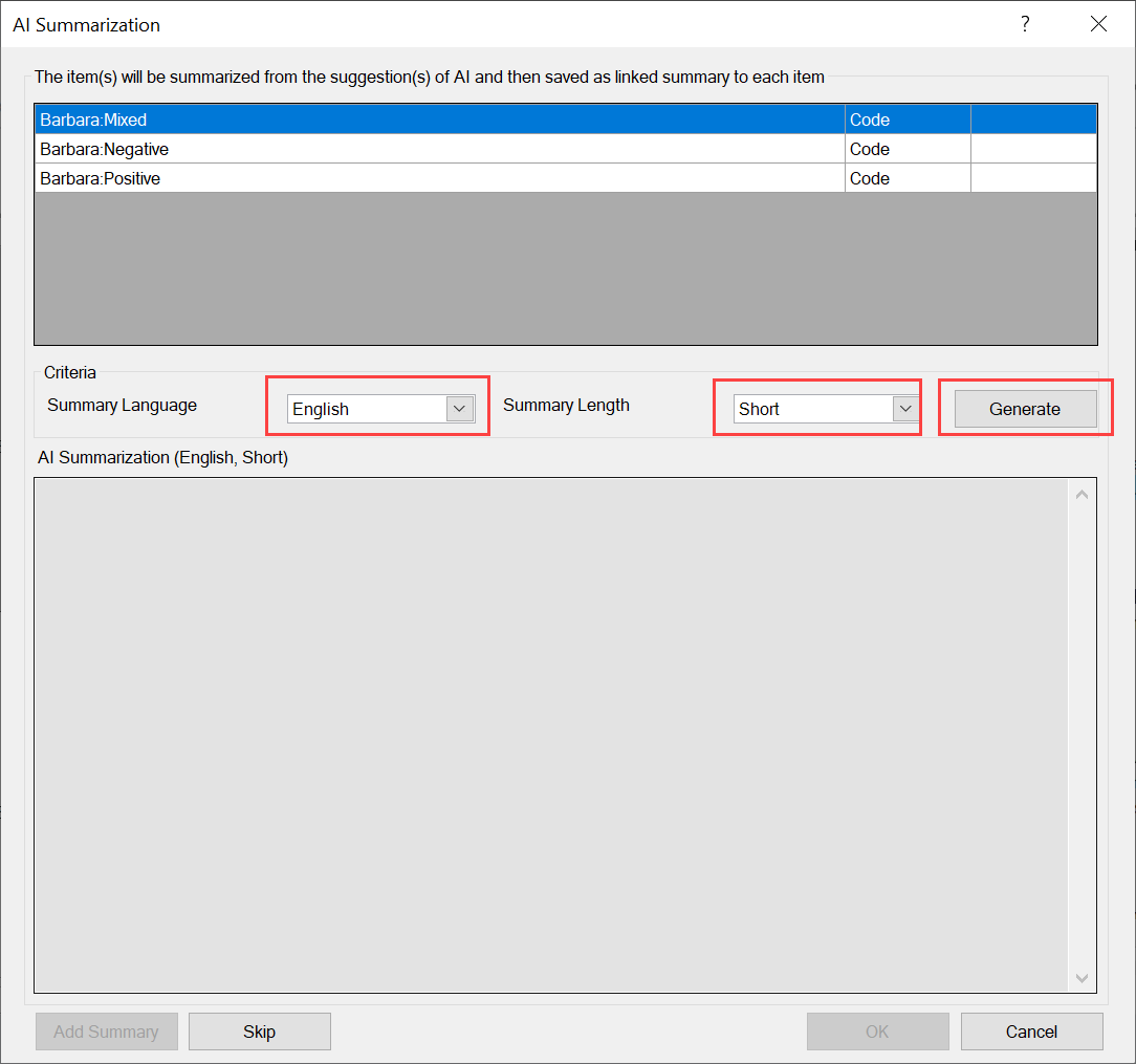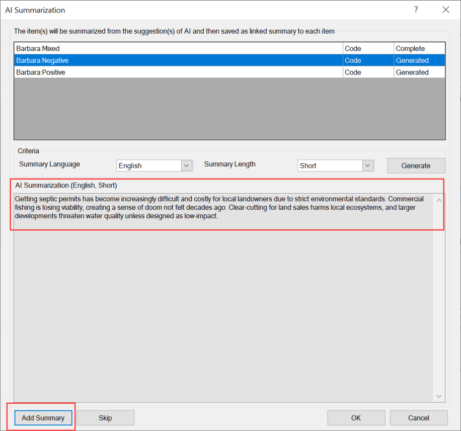 When the first item's summary is displayed, its status will change to Generated. Review the provided summary and click Add Summary to accept the AI summary. You can also click the Generate button again to have AI re-generate a summary. Alternatively, you can click Skip to progress and highlight the next item. The status for each item will change to Complete or Skipped as you choose.