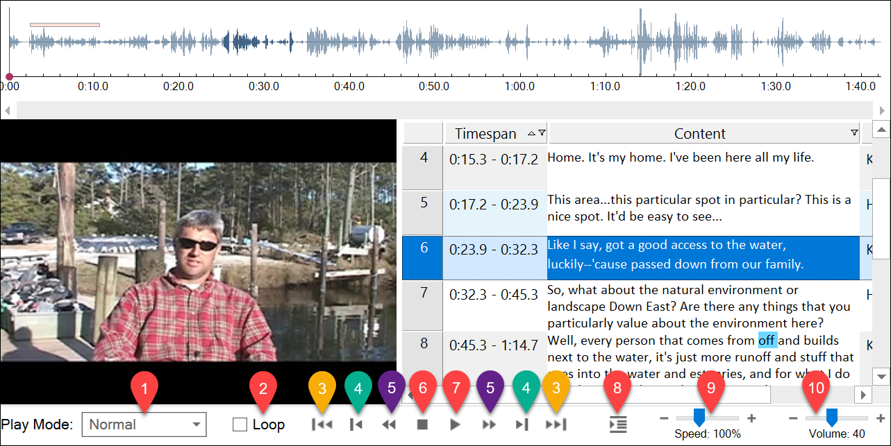 8 Play Selected Rows—play the media for a selected entry in the transcript.